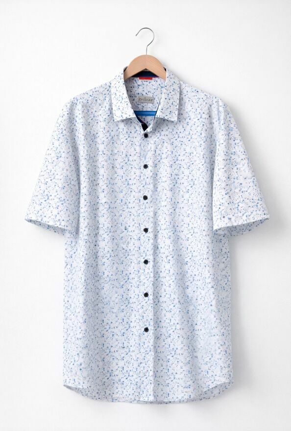 Stylowa koszula z krótkim rękawem w jasnym kolorze z delikatnym, niebieskim wzorem. Idealna na wiosnę i lato – świetnie sprawdzi się zarówno na co dzień, jak i na spotkania czy wyjścia.Stan: idealny / niezniszczona